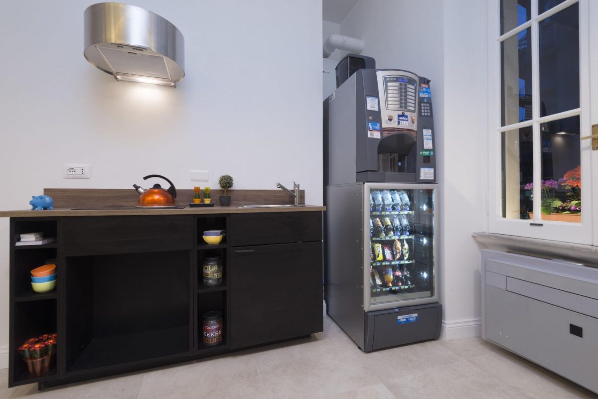 C’è anche una bella sala comune adibita a cucina, con televisione e distributore di bevande calde e fredde. Se lo desiderate, potete iniziare qui la vostra giornata per gustarvi un caffè e scambiare informazioni e consigli con gli altri ospiti.