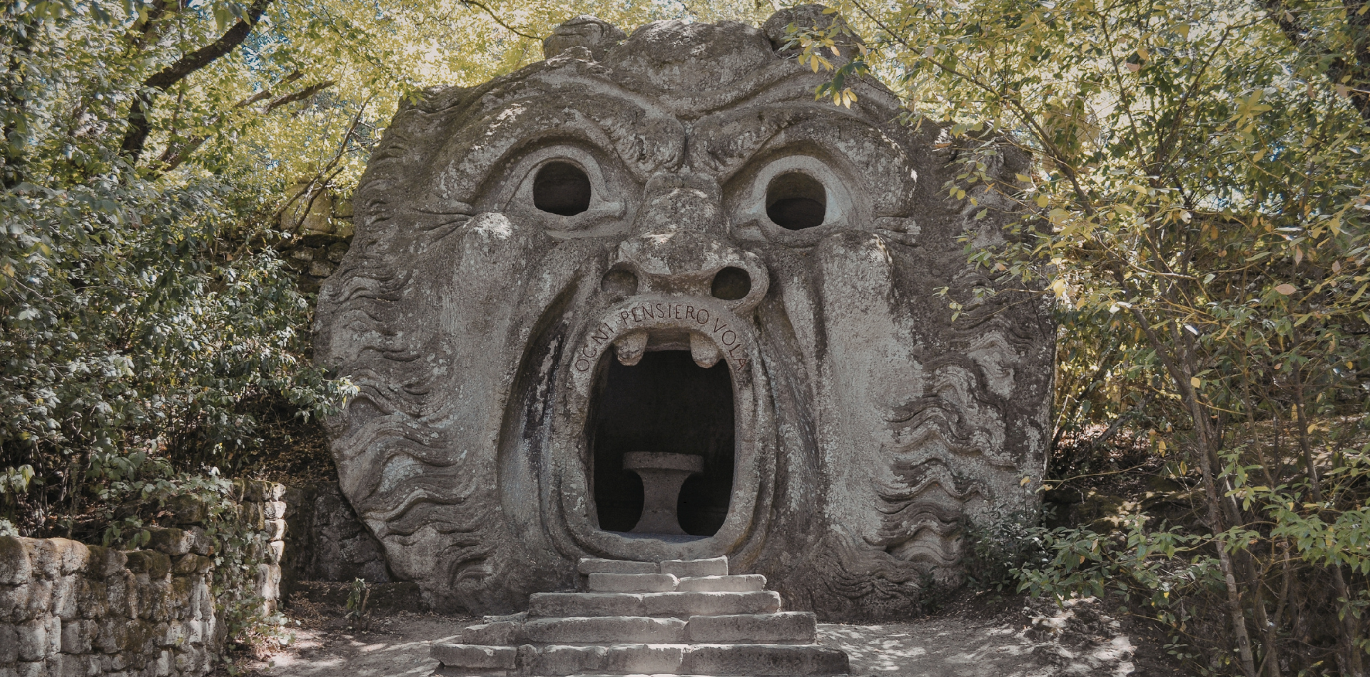 Le due sfingi all’ingresso con la loro iscrizione bidirezionale sono il primo indizio di ciò che aspetta il visitatore: un luogo che non dà risposte, ma pone domande. L’opera più iconica del parco è però senz’altro l’Orco: una testa colossale con la bocca spalancata, aperta come l’ingresso di una grotta. All’interno si trova un vero e proprio antro con un tavolo di pietra e una seduta. L’iscrizione sul labbro superiore cita “ogni pensiero vola” — una parafrasi modificata del verso dantesco “lasciate ogni speranza, o voi ch’entrate”. Avvertimento o invito?